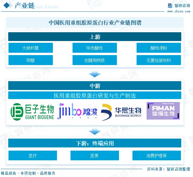 中国医用重组胶原蛋白行业产业链各环节分工明确且协同紧密,上游是供应稳定的基础原料环节,以大肠杆菌、毕赤酵母等微生物菌种,酵母浸粉、甲醇等培养与发酵用物质及无菌包装材料为主,且原料供应正逐步实现国产自主可控;中游作为核心环节,由锦波生物、巨子生物等具备核心技术和相关资质的企业主导,负责通过发酵、纯化等工艺实现重组胶原蛋白的规模化制备,并加工成医美注射剂、医用敷料等终端产品,该环节技术与资质壁垒高,且呈现原料与终端生产一体化趋势;下游则聚焦医疗、医美、消费护理等多元需求领域,既涵盖医院骨科、皮肤科及民营医美机构等专业场景,也包含功效性护肤品等零售场景,通过医院采购、医美机构直供及电商平台等线上线下渠道触达用户,其中医美领域需求爆发式增长,成为驱动产业链运转的核心动力之一。
