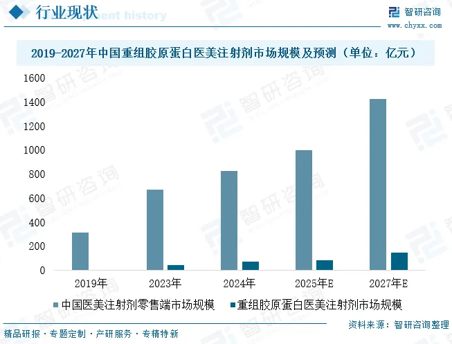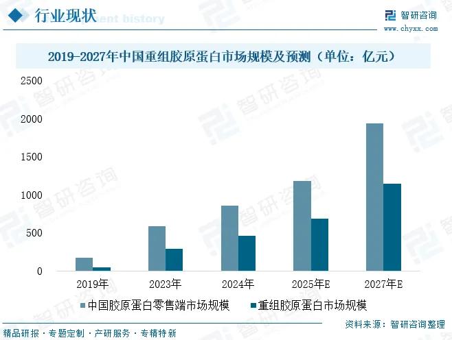 胶原蛋白作为人体组织器官的核心结构蛋白,占人体蛋白质总量的30%~40%,广泛分布于皮肤、骨骼、软骨等组织中,深度参与人体组织修复与再生过程,是维持机体结构完整性和生理功能的关键物质。重组胶原蛋白依托基因工程技术制备,不仅延续了天然胶原蛋白的生物学功能,更在生物活性、相容性等方面实现优化,成为生物医学与护肤领域的核心材料。从市场规模来看,行业呈现爆发式增长态势。2019-2023年中国胶原蛋白零售端市场规模从168亿元增至584亿元,年复合增长率高达36.5%,预计2027年将突破1937亿元;其中重组胶原蛋白表现尤为突出,2023年市场规模达286亿元,预计2027年将增至1145亿元,2023-2027年复合增速预计达41.4%,而重组Ⅲ型胶原蛋白凭借独特的三螺旋结构优势,已成为研发与应用进展最快的型别之一。