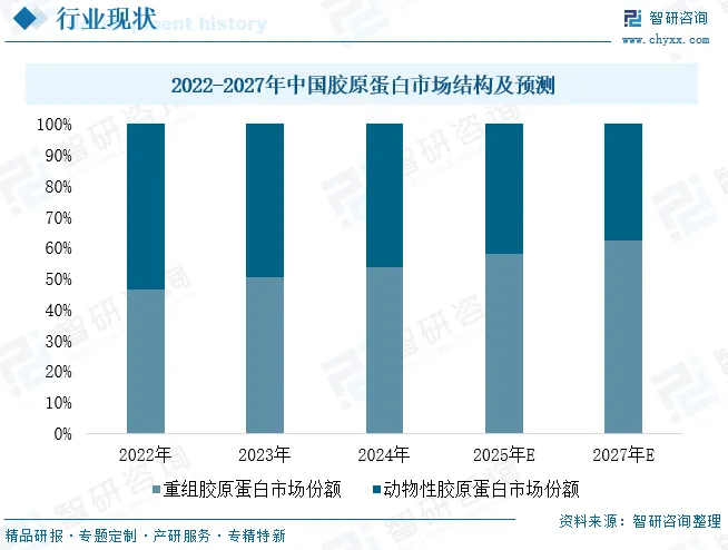 相较于传统的动物源性胶原蛋白,重组胶原蛋白在生物活性、生物相容性、安全性(免疫原性更低、无病原体风险)及加工性能(水溶性佳、可优化)方面具备显著优势,因此应用空间更为广阔。随着基因工程与发酵技术的持续进步,重组胶原蛋白的市场份额快速提升,并于2023年以50.5%的占比首次实现对动物源产品的超越。预计这一结构性替代趋势将继续深化,到2027年,重组胶原蛋白的市场份额有望进一步扩大至62.3%,而动物源胶原蛋白的份额则可能相应收缩至37.7%。
