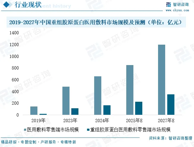 另一核心产品类别为医用敷料,主要应用于医美术后修复、敏感肌护理,以及痤疮、皮炎等皮肤问题的辅助治疗,产品形态以敷料贴、修复凝胶为主,凭借温和修护、适配敏感肌的特性深受市场认可。巨子生物旗下可复美类人胶原蛋白敷料凭借突出的修复功效,成为该细分领域的标杆产品,引领行业发展。近年来,受益于重组胶原蛋白生产工艺的持续成熟,叠加医美消费人群不断扩大、消费者皮肤修护意识提升,重组胶原蛋白医用敷料市场规模实现稳步增长。预计到2027年,该品类零售端市场规模将达到346亿元,占整体医用敷料零售端市场规模的29%,在医用敷料赛道的核心地位将进一步巩固。