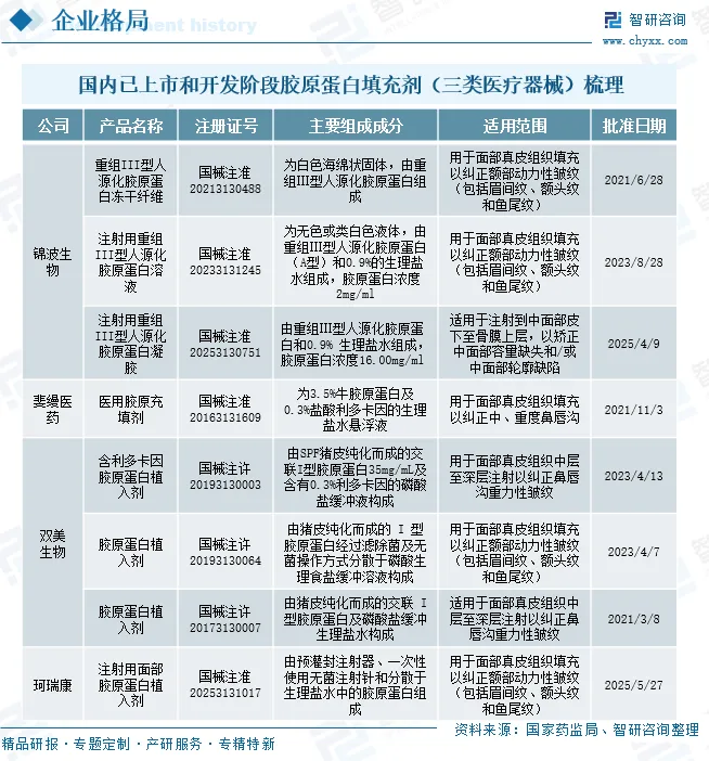 在医用重组胶原蛋白领域,三类医疗器械注册证是进入医美注射市场的核心准入壁垒。目前,锦波生物是国内唯一拥有重组胶原蛋白三类证的企业,独占这一赛道。根据国家药监局信息,其已相继获批三款产品:2021年的“重组Ⅲ型人源化胶原蛋白冻干纤维”、2023年的“注射用重组Ⅲ型人源化胶原蛋白溶液”以及2025年最新的“注射用重组Ⅲ型人源化胶原蛋白凝胶”,实现了产品形态与适用范围的持续升级。相比之下,当前市场上其他已上市的胶原蛋白注射剂(如双美生物、斐缦的产品)均来源于动物源(猪或牛)。