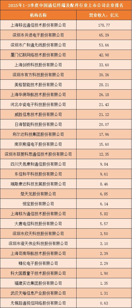 一、2025年1-3季度中国通信终端及配件行业上市公司企业排名分析