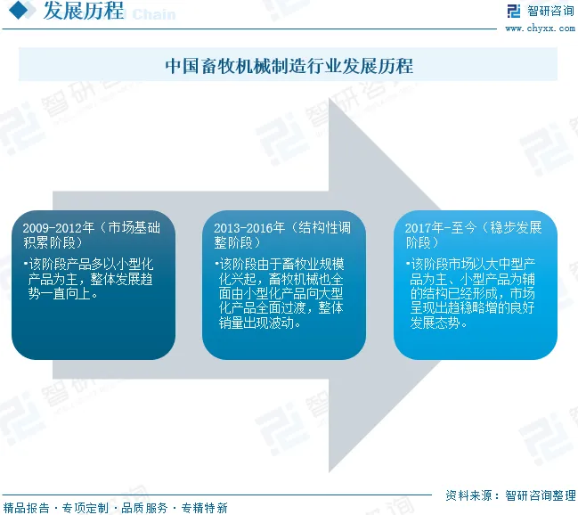 中国畜牧机械制造行业自2009年起步发展至今,大致可分为市场基础积累、结构性调整和稳步发展三个阶段。在市场积累阶段,产品多以小型化产品为主,整体发展趋势一直向上。在结构性调整阶段,由于畜牧业规模化兴起,畜牧机械也全面由小型化产品向大型化产品全面过渡,整体销量出现波动。在稳步发展阶段,市场以大中型产品为主、小型产品为辅的结构已经形成,市场呈现出趋稳略增的良好发展态势。