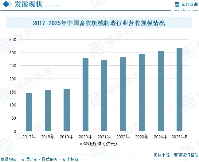 畜牧机械制造业是为满足农场、养殖场等各类畜牧业经营活动需求,通过提供专业机械设备与技术支持的行业。我国畜牧机械制造业自起步以来,经历了从模仿国外产品到结合本土农业实情进行自主研发制造的转型,并随着畜牧业日益集中化与规模化而步入高速发展阶段。2021年,受下游养殖行业周期性波动影响,行业营收规模较2020年出现小幅下滑,降至271.87亿元,同比下降2.87%。自2022年起,随着下游畜牧业景气度回暖,行业营收规模开始恢复增长,2024年达到305.8亿元,同比增长4.15%。展望未来,在畜牧业持续向规模化、集约化、自动化与智能化方向加速推进的背景下,我国畜牧机械制造行业将迎来广阔的发展空间,预计2025年行业营收规模将进一步提升至315.83亿元。