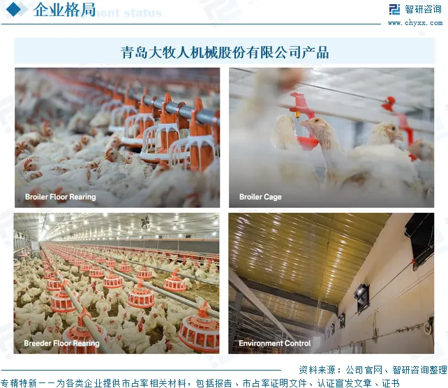 青岛大牧人机械股份有限公司总部位于山东青岛城阳空港工业园,是一家从事养殖设备制造的民营企业。公司主营畜禽养殖设备研发制造,主要产品为:蝴蝶拢风筒风机、50”36”轴流风机、湿帘进风窗系统、喷雾系统、种鸡链盘式喂料系统、公鸡喂料盘、肉鸡喂料盘、料塔、肉鸡笼养设备、乳头自动饮水系统、环境控制器BH8218、种鸭、肉鸭、鹅用可拆卸料盘、自动产蛋箱、自动清粪机、禽舍地板及支架、种鸡链式喂料系统,业务覆盖国内及全球80余个国家和地区。