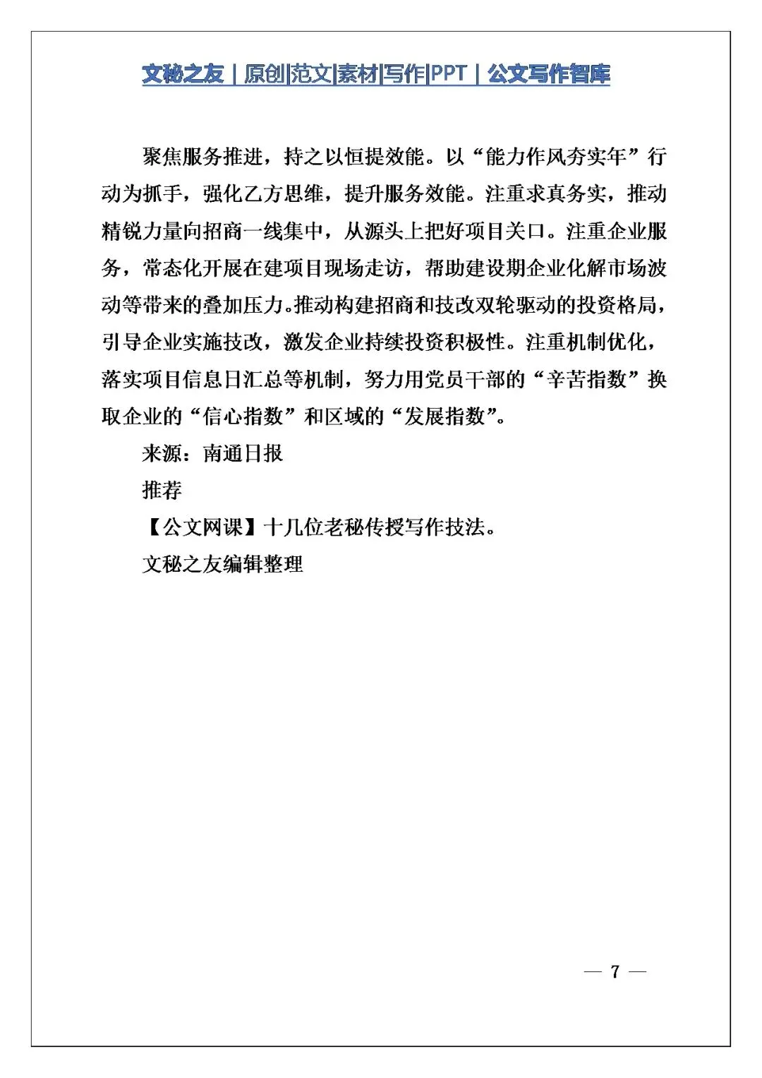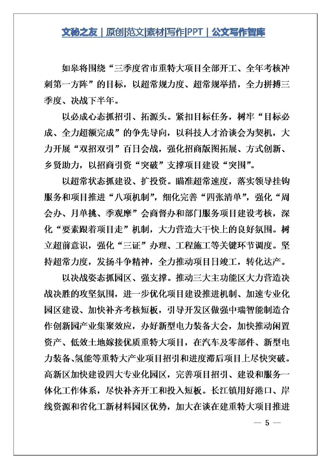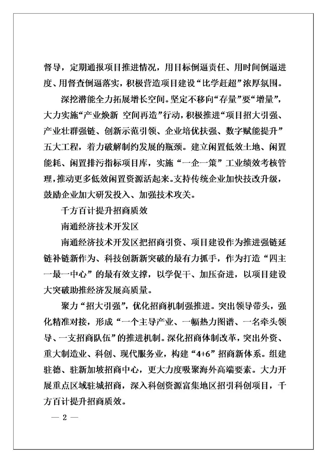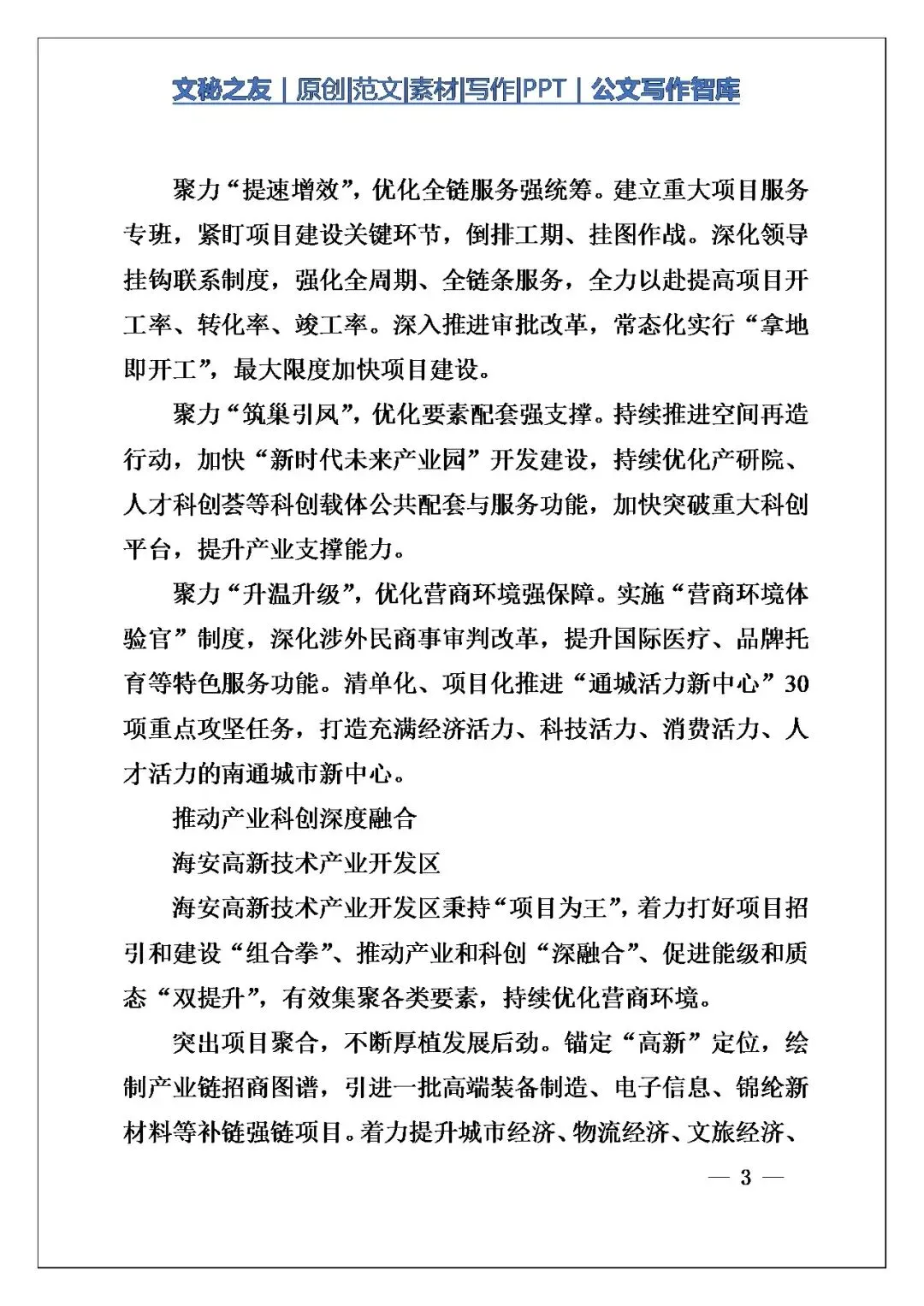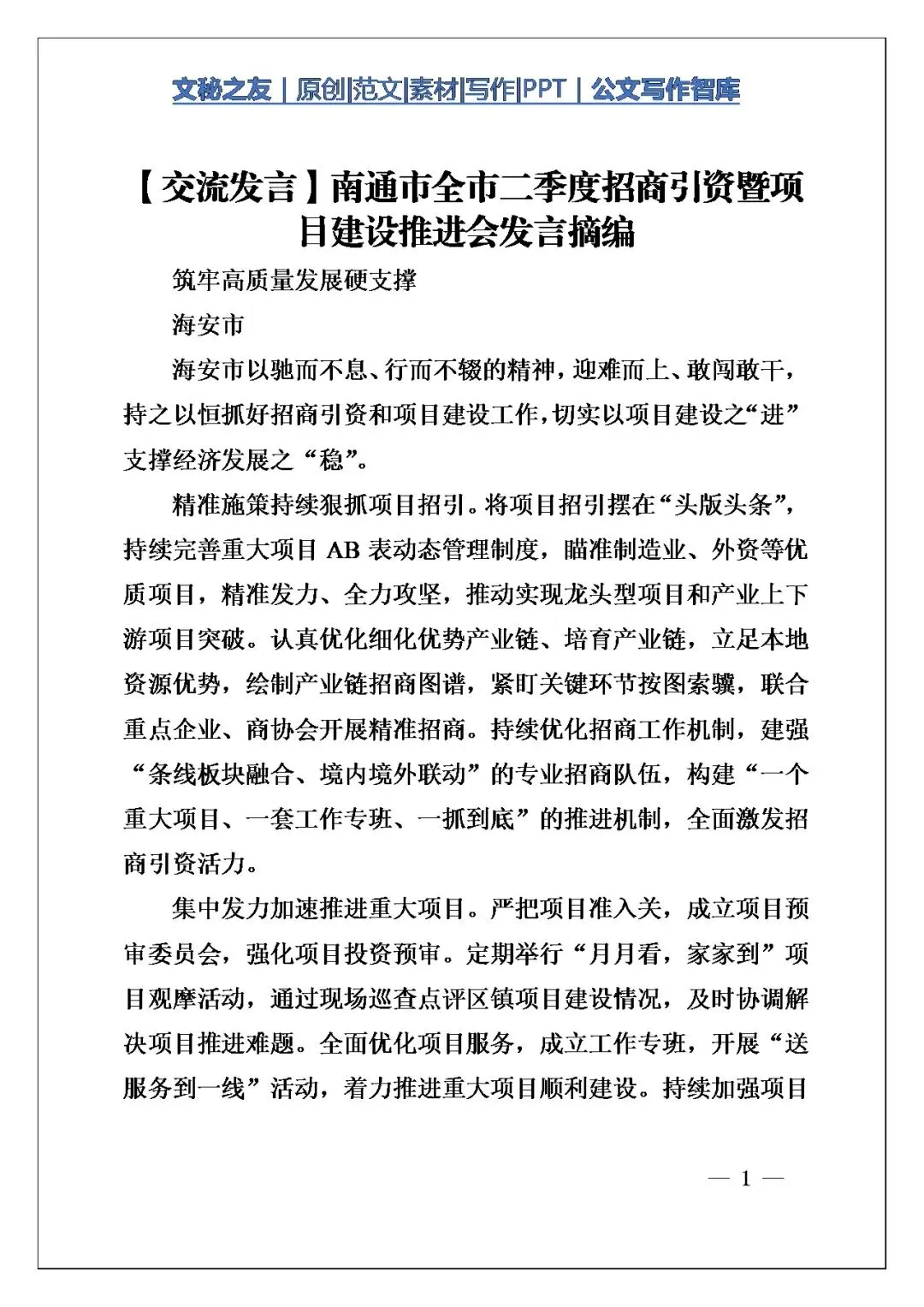 今天这篇《【交流发言】南通市全市二季度招商引资暨项目建设推进会发言摘编》,我翻了一遍,觉得写得特别扎实,不是那种空喊口号的材料。写作角度选得好,把海安、如皋、通州湾材料中这些不同层级的单位放在一起讲,各有侧重,围绕“项目为王”这个核心,形成了一种上下联动、多点发力的格局。