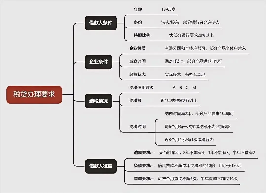 虽然企业税贷的优点很多,但它对借款人的资质+个人和企业征信+企业经营情况,会有一定要求,具体请看下图: