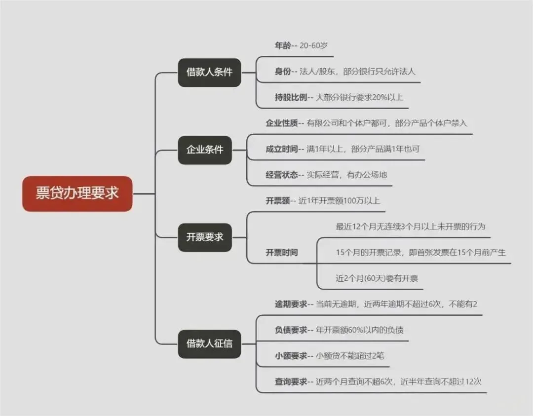 企业票贷办理主要是参考企业开票数据+企业和借款人征信+借款人资质,票贷的要求相比税贷会宽松很多,贷款要求如下图: