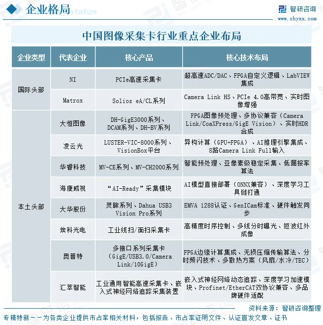 中国图像采集卡行业呈现典型的分层动态竞争格局:国际领先厂商(如NI、Matrox)凭借其在超高速采集、高精度数据处理及FPGA底层技术上的深厚积累,主导着半导体测试、高端医疗等对性能与可靠性要求严苛的市场;而本土头部企业(如大恒图像、凌云光)与创新力量(如埃科光电、汇萃智能)则依托显著的性价比、敏捷的本地化服务及对具体场景的深度理解,已在工业视觉检测、安防监控等主流领域建立起优势,并正通过集成AI智能处理、实现多协议兼容等技术突破,持续向高端应用领域渗透。在技术布局上,各方路径差异显著:国际厂商聚焦于高带宽接口、自定义计算架构等基础技术创新与生态构建;本土企业则更侧重于解决工业现场的实际痛点,针对性发展低延迟传输、多通道同步、智能预处理以及适应复杂环境的散热设计,并通过将异构计算、嵌入式AI推理引擎等技术与锂电、精密制造等特定行业深度结合,形成了鲜明的差异化竞争优势。