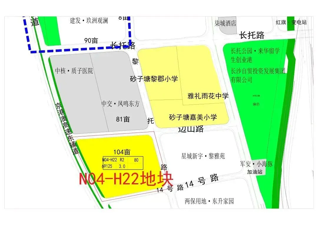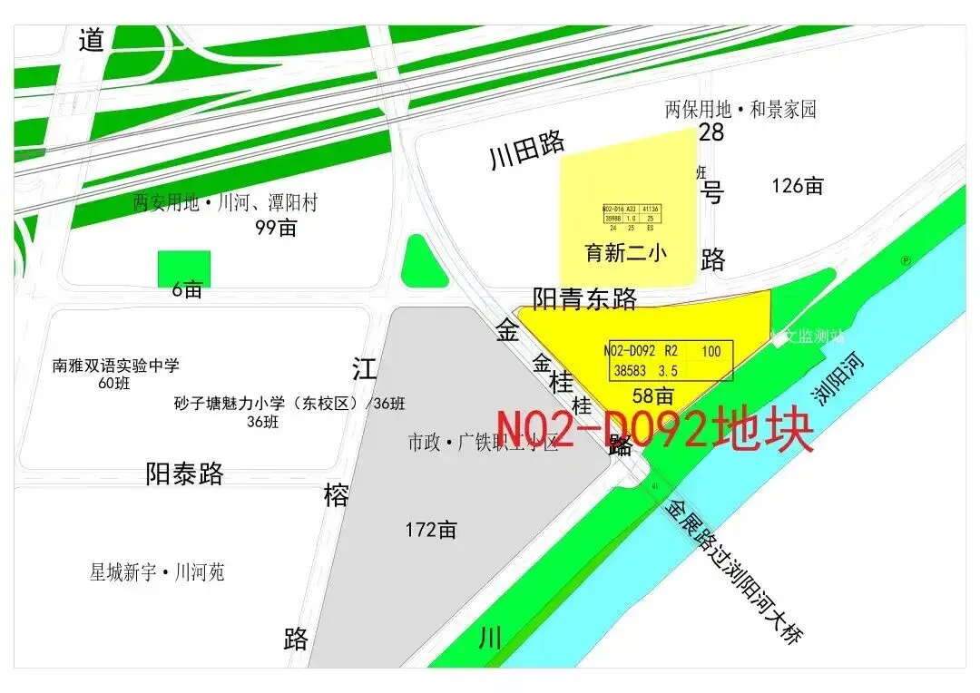 核心优势:滨水宜居大盘,教育配套先行。地块东侧紧邻浏阳河风光带及41亩城市公园,具备打造高端滨水住宅的天然景观基因;西北侧规划有中雅培粹九年一贯制学校,目送式教育资源极大提升项目附加值;近300亩的净地规模,适合打造片区标杆性品质社区。