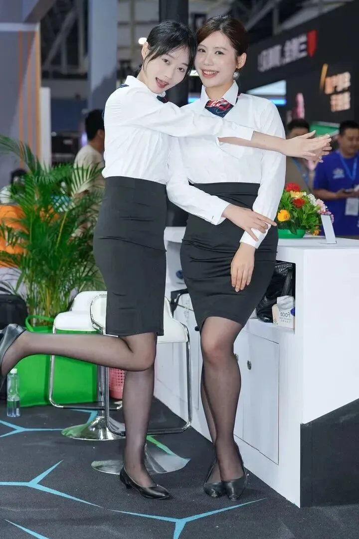 先来看.看这.对超养.眼的姐妹花!.左边.的短发妹子,.白衬衫加了.个小花纹领结.,一下子.就把普通.职业装.盘活了.。配上黑色包.臀短裙和丝袜.,俏皮地抬.个腿,甜酷感.直接拉满。右.边的长发妹子.呢,乖.乖站在展台.边,同样的白.衬衫黑裙子.,但领结更.亮眼,气质.温柔得像邻.家姐姐。两人.站一起,.职场利.落里藏.着少女心,谁.看了.不多瞄两眼?