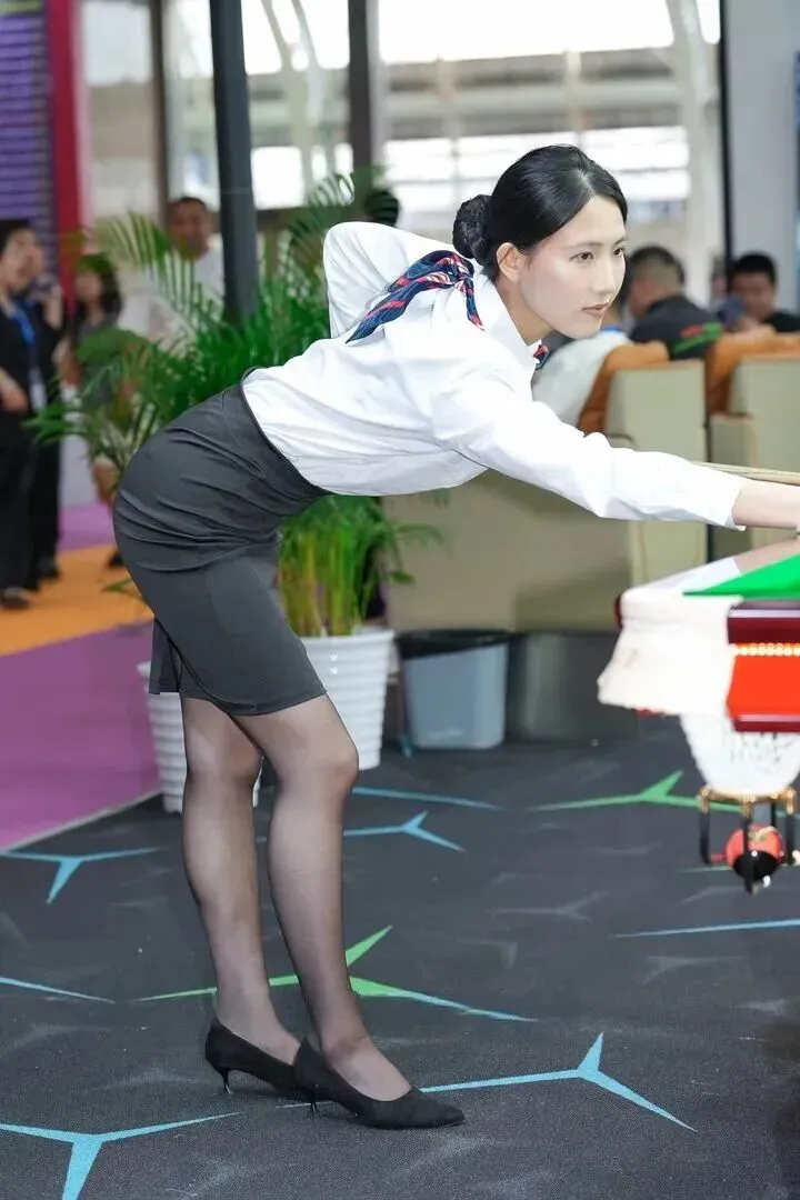 .另一位.小姐姐俯身.靠在台球桌.边,盘发造.型高.级感十足.。白衬.衫的丝巾设.计别致,深灰.色包臀裙.还带开叉小心.机,.配上尖.头细高跟.,气质直接.封神!.就算在展会.休闲区,.也保持精致.,这.穿搭.功力我服了.。