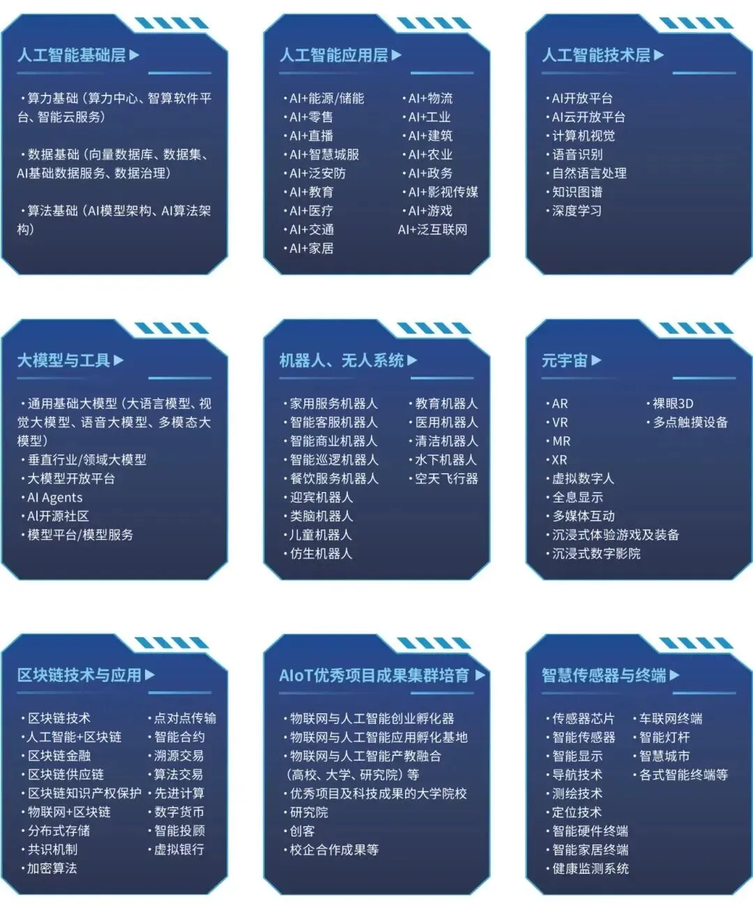 本届展会打破传统展会“技术碎片化”痛点,构建“基础层 - 技术层 - 应用层”三维展品体系,让观众一站式看透 AI 产业核心布局。展品范围全面覆盖人工智能全产业链。从算力中心、向量数据库等基础层核心设施,到计算机视觉、自然语言处理等技术层关键技术,再到AI+医疗、AI+工业、AI +教育等应用层多元场景,全方位展示大模型、人形机器人、虚拟数字人、元宇宙等前沿成果,其中 “具身智能交互专区” 可让观众近距离体验 AI 机器人的自主决策与协同作业能力。