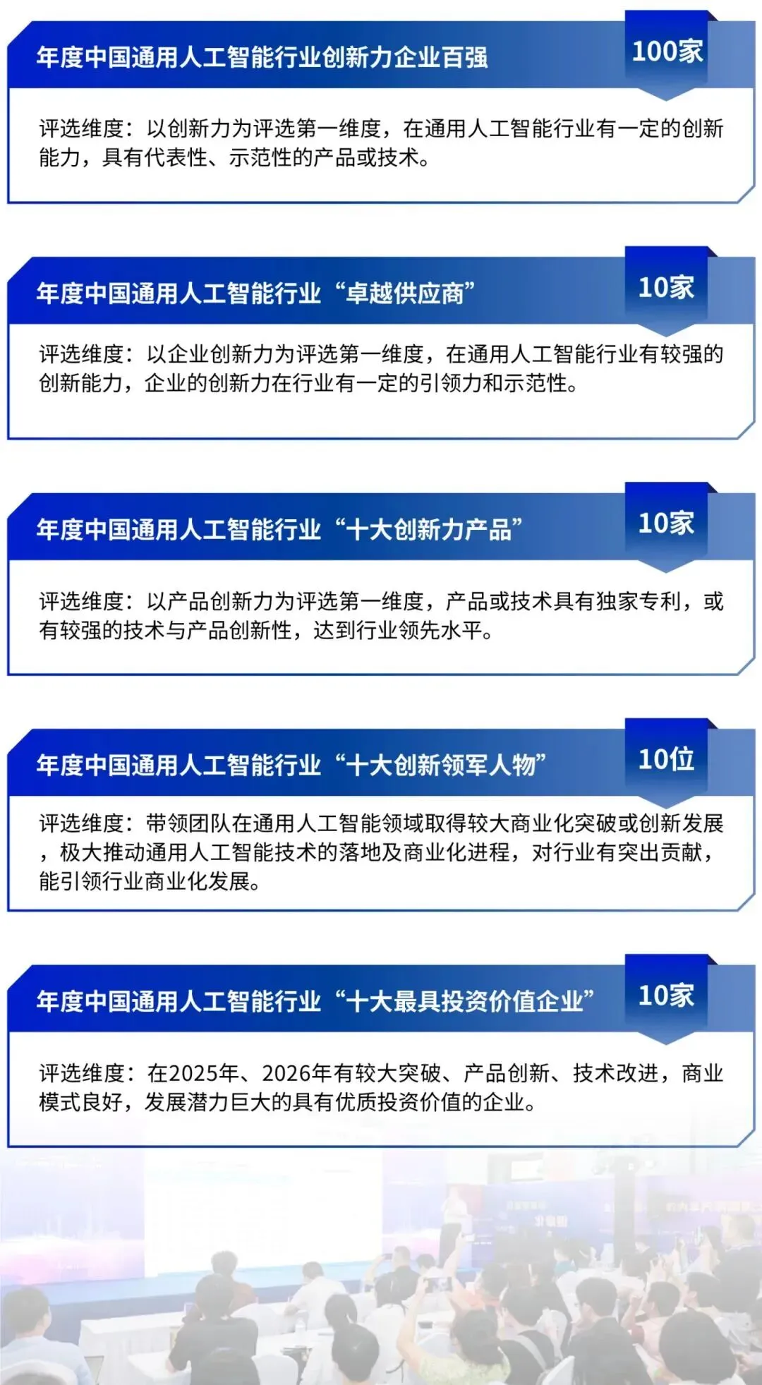 本届年度“中国通用人工智能行业颁奖盛典”将重磅揭晓“创新力企业百强”、“十大创新力企业”等权威奖项。我们旨在以此梳理并表彰行业内的年度突破性成果与标杆力量,见证标杆的诞生,并与真正推动行业前进的创新者同行。