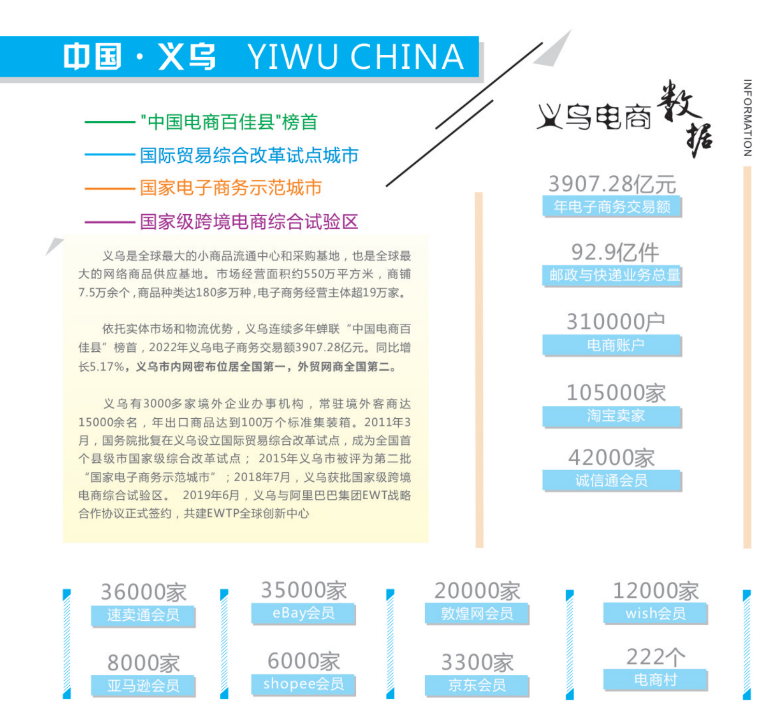 2011年以来全市电子商务交易额每年保持15%以上的增速。2019年1月8日,阿里巴巴发布2018年阿里县域电商GMV数据,义乌稳居第一。2019年全市实现电子商务交易额2768.92亿元,同比增长16.92%。义乌邮政和快递业务总量累计完成49亿件,居全国第二,入选全国快递示范城市。截至2019年12月,全市经工商登记电子商务经营主体超19万家,同比增加72%。全市电商账户数超31万,其中内贸网商账户数超17万户,外贸网商账户数超14万户。内贸网商密度位居全国第一,外贸网商密度全国第二。2018年7月13日,国务院常务会议决定在北京等22个城市新设一批跨境电商综合试验区,义乌作为全国唯一的县级市位列其中。2019年,全市实现跨境网络零售交易额297.84亿元,同比增长17.37%。据不完全统计,跨境快递出口日均超过150万票,其中,义乌国际邮件互换局出口7600万票,同比增幅34%。义乌跨境电商保税进口(1210)业务超871万票,销售额达11.7亿元,整体业务量位居全国第三批跨境电子商务综合试验区前列。全市网拍摄影、代运营、创意设计、推广、人才培训、第三方仓储等电子商务配套产业,实现集聚发展。电商空间载体不断增加,“镇-园区-村”的发展格局基本形成。全市共有35个电商产业园,建筑面积超200万方,有164个电商村,聚集各类电商企业超2500余家。2018年出台《关于促进商贸业高质量发展的若干意见(试行)》,从房租、税收、人才子女入学等方面,为产业发展提供了良好的政策环境。自2014年起,连续六年举办“中国国际电子商务博览会”和“世界电子商务大会”,多次获得中央媒体高度评价及省级领导批示肯定。全市成立电子商务促进会、跨境电子商务协会等行业协会以及诚商会等20多个商圈,每年开展各类论坛、活动400场以上,形成了层次多、范围广的电商人才培训生态体系。单品引爆、网红操作、微视频等新的电商与文化结合模式不断涌现,北下朱的创业之家,新光汇四季严选直播基地,进一步推动了网红经济的迅速发展。2019年6月19日,义乌市与阿里巴巴集团eWTP战略合作协议正式签约,共建eWTP全球创新中心,探索数字贸易的新模式、新规则,目前已落地eWTP菜鸟保税仓、“义乌+阿里巴巴”跨境出口新模式、eWTP菜鸟号等项目。
