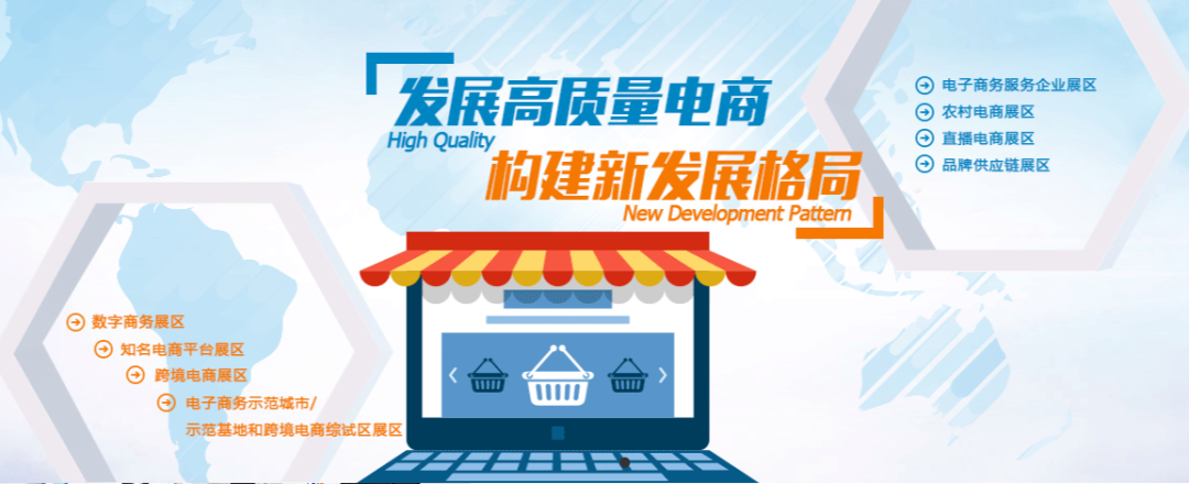 (1)数字商务展区:数字贸易、数字智造、数字金融、数字教育、数字医疗、数字娱乐生活、智慧城市、物联网、大数据无人售货等(2)知名电商平台展区:国内外知名电子商务平台、商城(3)跨境电商展区:跨境电商平台、跨境物流、海外仓、跨境支付、税务、检测、知识产权等跨境服务机构(4)电子商务示范城市/示范基地/跨境电商综试区:国家发改委、商务部认定的电子商务示范单位、跨境电商综试区、省级政府认定的电子商务示范单位(5)电子商务服务企业展区:物流快递、第三方仓储、应用软件、小程序、银行、第三方支付、电商园区、电商培训、商标注册、知识产权、网络营销推广、金融投融资服务、会计服务、人才与培训教育、电脑及相关设备、网络及电信运营设备与服务、质量与安全认证等(6)直播电商展区:直播平台、MCN机构、网红直播基地、直播教育机构、直播技术服务机构,直播制作服务机构等(7)农村电商展区:电子商务进农村综合示范县、农村电商平台、农村电商优质商品等(8)品牌供应链展区:网络商品、新国货、产业带、跨境商品、直播商品等
