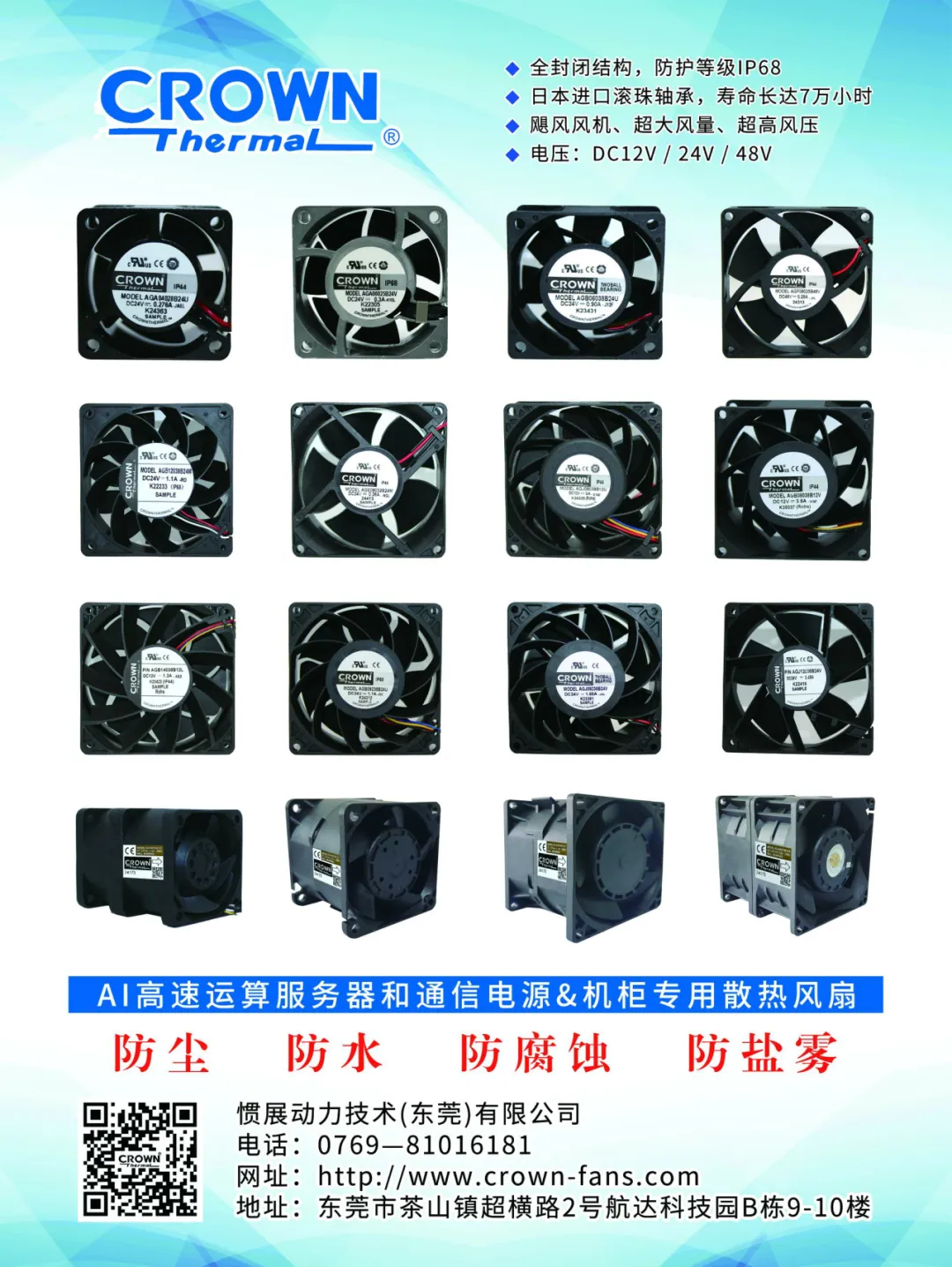 惯展动力成立于2007年,最早与国外知名品牌合作生产高品质散热风扇产品。近二十年来,我们坚持创新,专业研发适应工业领域需要的散热风扇,与客户一起开发适合各行业领域的高性能AC(EC)和DC全系列散热风扇、防爆风机等产品。超高转速、大风量、低功耗、PWM可调速、RD报警和FG反馈信号输出的智能化、环保型全系列散热风扇。在工控自动化、新能源、AI人工智能、数据中心……等等行业应用的低功耗、大风量、长寿命的风扇产品,以及防水等级达到IP68的全系列散热风扇。