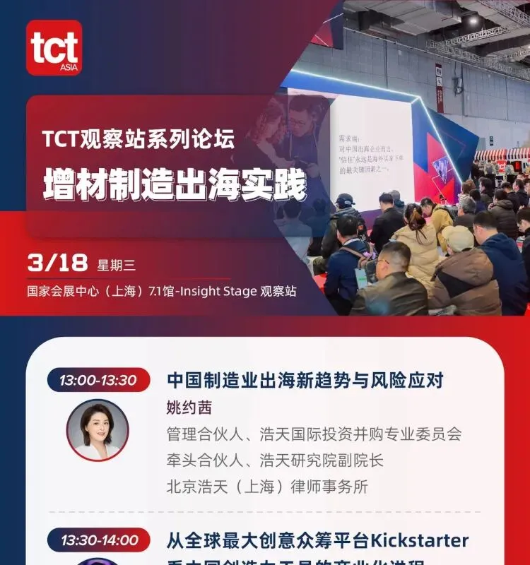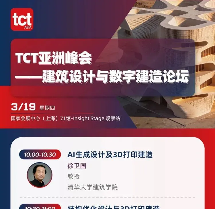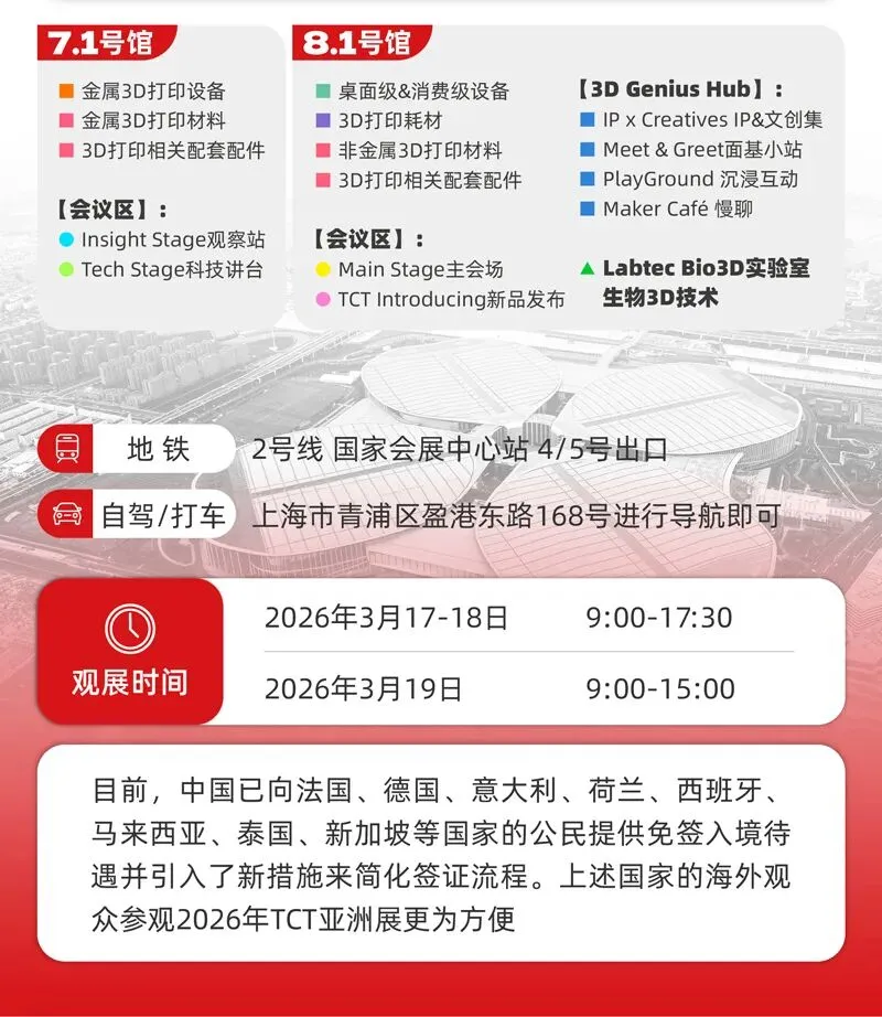 2026年TCT亚洲展将于2026年3月17-19日在国家会展中心(上海)7.1&8.1馆举办,规模预计达55,000平方米,吸纳550+参展商和40,000+名专业观众共襄盛举,3D打印新品将超1000件。同期将举办超100场主题论坛。