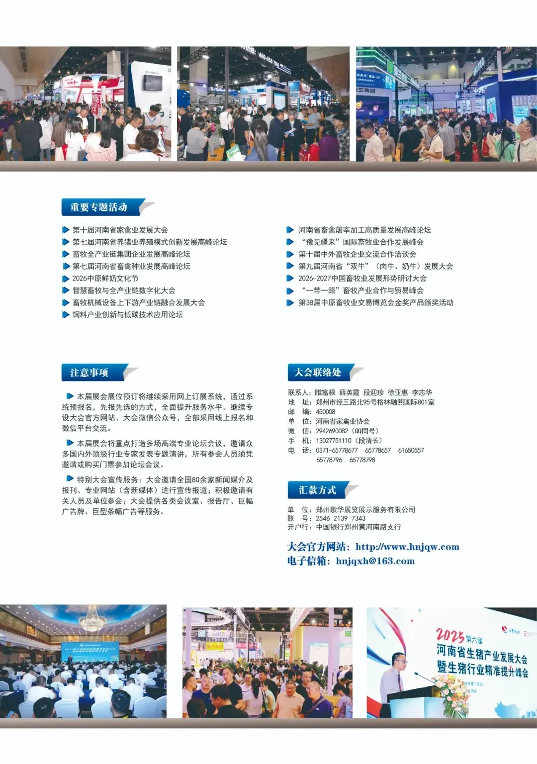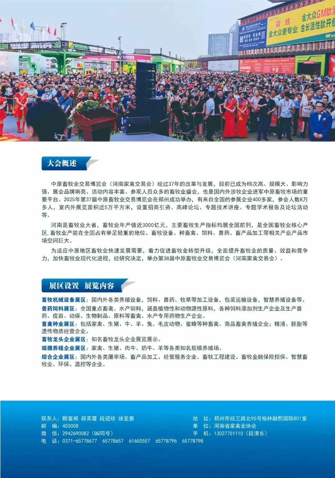 中原畜牧业交易博览会(河南家禽交易会)经过37年的改革与发展,目前已成为档次高、规模大、影响力强、展会品牌响亮、活动内容丰富、参观人员众多的畜牧业盛会,也是国内外涉牧企业进军中原畜牧市场的重要平台。2025年第37届中原畜牧业交易博览会在郑州成功举办,有来自全国的参展企业400多家,参会人数8万多人,室内外展览面积近5万平方米,设置招商引资、高峰论坛、专题技术讲座、专题学术报告及论坛活动等。