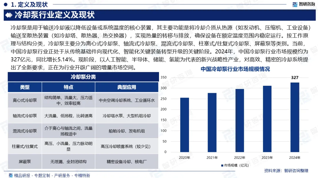 市场规模:当前,中国冷却泵行业正处于从传统基础件向现代化、智能化关键装备转型升级的关键阶段。2024年,中国冷却泵行业市场规模约为327亿元,同比增长5.14%。现阶段,以人工智能、半导体、储能、氢能为代表的新兴战略性产业,对高效、精密的冷却系统提出了全新要求,正在为行业开辟广阔的增量市场空间。