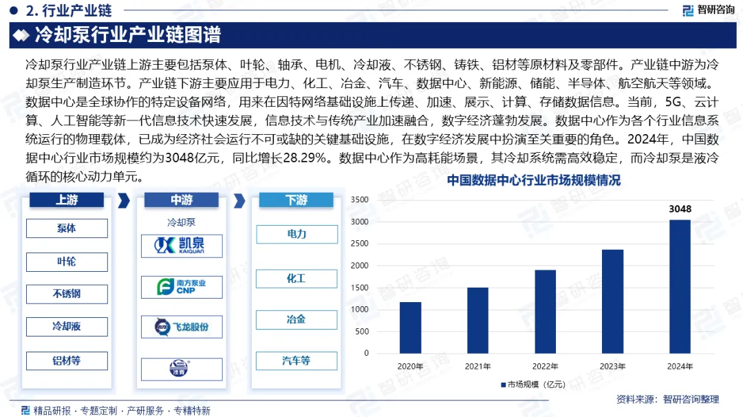 产业链核心节点:数据中心是全球协作的特定设备网络,用来在因特网络基础设施上传递、加速、展示、计算、存储数据信息。当前,5G、云计算、人工智能等新一代信息技术快速发展,信息技术与传统产业加速融合,数字经济蓬勃发展。数据中心作为各个行业信息系统运行的物理载体,已成为经济社会运行不可或缺的关键基础设施,在数字经济发展中扮演至关重要的角色。2024年,中国数据中心行业市场规模约为3048亿元,同比增长28.29%。数据中心作为高耗能场景,其冷却系统需高效稳定,而冷却泵是液冷循环的核心动力单元。
