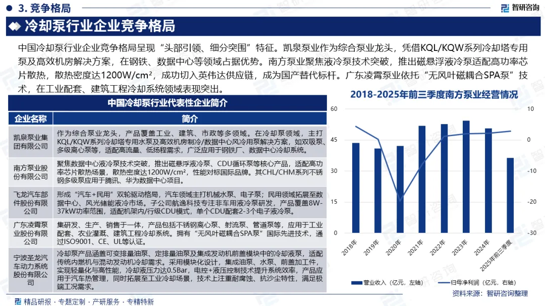 竞争情况:中国冷却泵行业企业竞争格局呈现“头部引领、细分突围”特征。凯泉泵业作为综合泵业龙头,凭借KQL/KQW系列冷却塔专用泵及高效机房解决方案,在钢铁、数据中心等领域占据优势。南方泵业聚焦液冷泵技术突破,推出磁悬浮液冷泵适配高功率芯片散热,散热密度达1200W/cm²,成功切入英伟达供应链,成为国产替代标杆。广东凌霄泵业依托“无风叶磁耦合SPA泵”技术,在工业配套、建筑工程冷却系统领域表现突出。