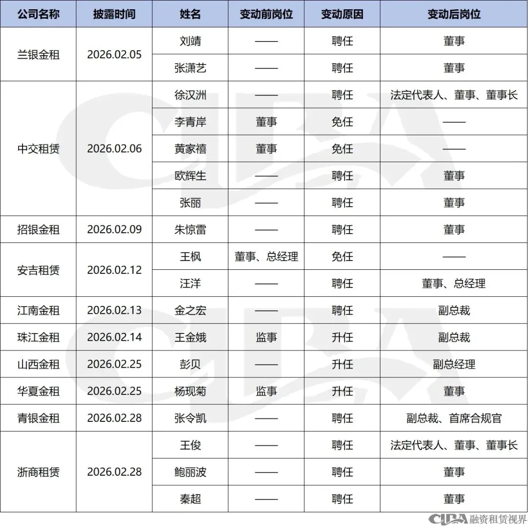 据不完全统计,2026年2月,我国融资租赁行业共计发生18项管理层职务调整,涉及10家融资租赁企业。其中,7家金融租赁公司共计发生8项人事变动,3家融资租赁公司共计发生10项人事变动。