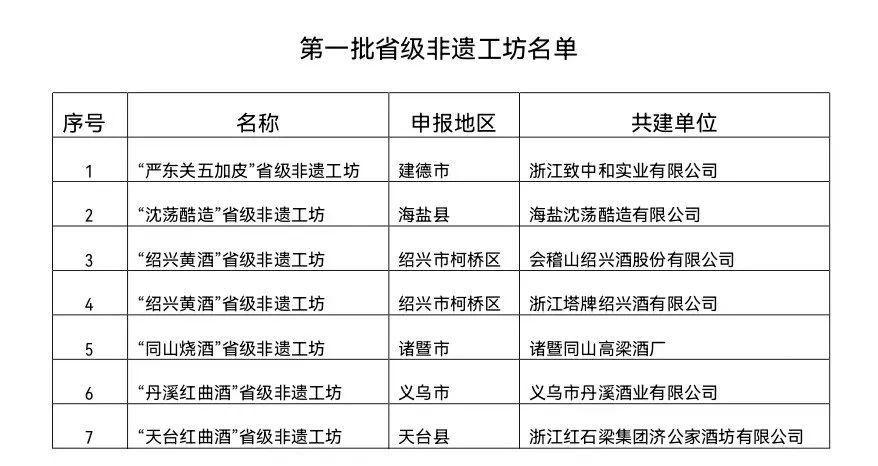 日前,浙江省文化和旅游厅公布了第一批省级非遗工坊名单,总计81个省级非遗工坊,浙江酒业有7家单位榜上有名:“严东关五加皮”省级非遗工坊/浙江致中和实业有限公司、“沈荡酷造”省级非遗工坊/海盐沈荡酷造有限公司、“绍兴黄酒”省级非遗工坊/会稽山绍兴酒股份有限公司,“绍兴黄酒”省级非遗工坊/浙江塔牌绍兴酒有限公司、“同山烧酒”省级非遗工坊/诸暨同山高梁酒厂、“丹溪红曲酒”省级非遗工坊/义乌市丹溪酒业有限公司、“天台红曲酒”省级非遗工坊/浙江红石梁集团济公家酒坊有限。