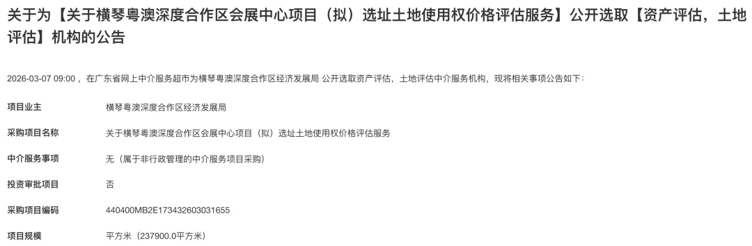 就在昨日,官方公布了一则关于为【关于横琴粤澳深度合作区会展中心项目(拟)选址土地使用权价格评估服务】公开选取【资产评估,土地评估】机构的公告。