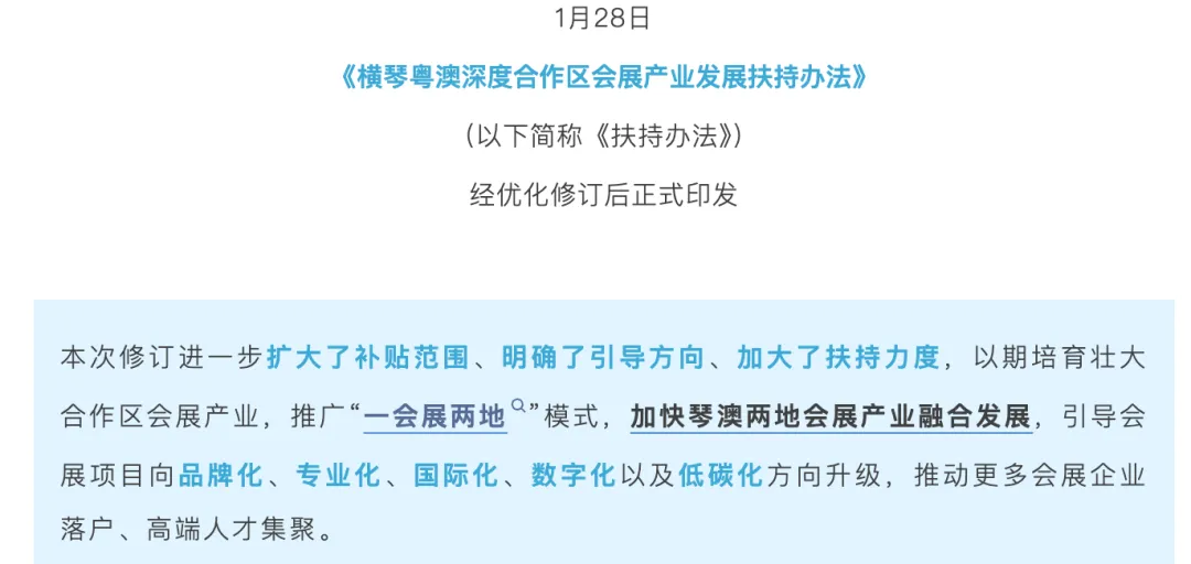 无独有偶,就在1月底,横琴出台了一则有关《横琴粤澳深度合作区会展产业发展扶持办法》,该政策围绕会展活动的全流程,给予展览、会议、参展参会、琴澳交流、国际认证、企业营收等17项补贴奖励。