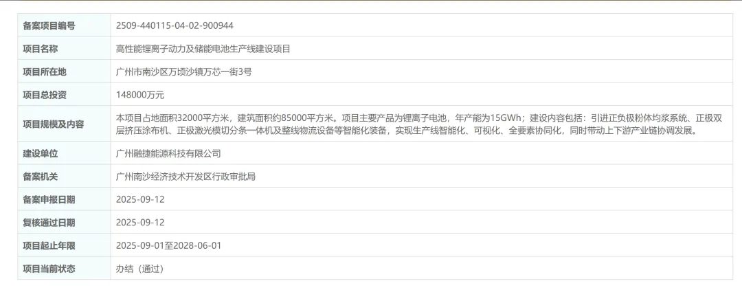 近日,广州市生态环境局发布了《关于高性能锂离子动力及储能电池生产线建设项目环境影响评价文件审批的公告》。项目由广州融捷能源科技有限公司投建,选址广州市南沙区万顷沙镇万芯一街3号,厂区总占地面积263361平方米,主要从事锂离子电池制造,年产锂离子电池10GWh。