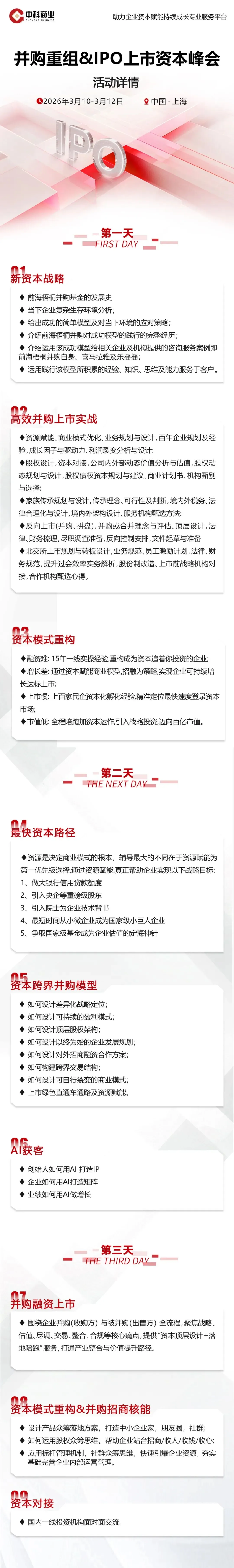 为了方便广大企业家掌握投资人的详细信息,了解资本市场更青睐哪种企业,清楚知道企业在并购、上市之前存在哪些不足,中科商业联合了各大知名投资机构,为广大企业家带来了一场与资本近距离的对接与学习盛会。