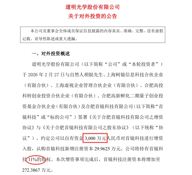 3月3日,AR智能终端企业首镜科技宣布完成A轮融资,由道明光学独家投资3000万元。此次增资完成后,道明光学将持有首镜科技11%的股权。这笔资金将全部投入首镜科技“年产25000套AR眼镜光学模组生产线”的建设,同时用于核心技术研发的持续投入及市场拓展。按照规划,该生产线预计在2027年12月31日前实现稳定量产,届时将大幅提升公司核心光学模组产品的供货能力。首镜科技成立于2019年,专注于AR智能终端的核心技术研发与整机制造,业务覆盖从显示模组、空间定位模组到配套应用软件的完整链条。其产品主打增强现实、智能识别、环境感知等核心功能,已在安防执法、工业巡检、智慧教育等B端垂直领域实现落地。从经营数据来看,公司2025年实现营业收入1592.25万元,较2024年的1291.85万元保持增长态势。