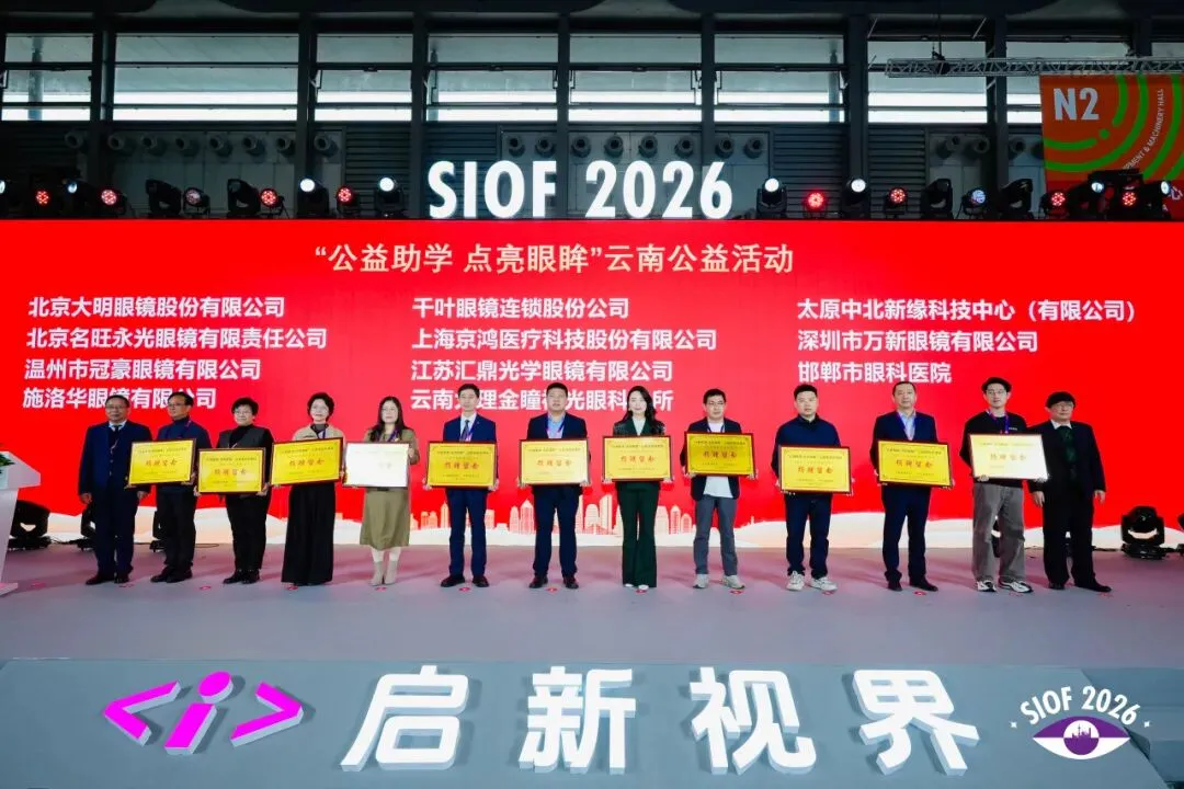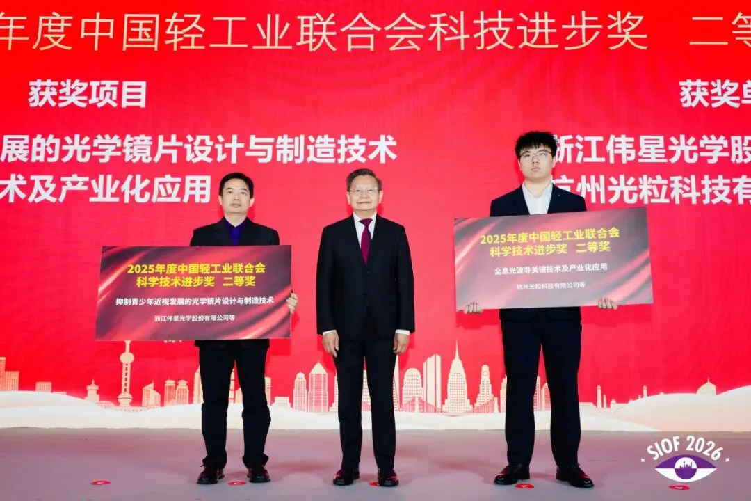 开幕式上为荣获2025年度中国轻工业联合会科技进步奖二等奖的浙江伟星光学股份有限公司和杭州光粒科技有限公司颁发证书。并对2025年积极参与敦煌研究院爱眼护眼公益活动和“公益助学 点亮眼眸”云南公益活动的企业进行了表彰,感谢他们在推动眼健康科普与公益助学方面作出的贡献,并倡导更多企业加入中国眼镜公益行动。