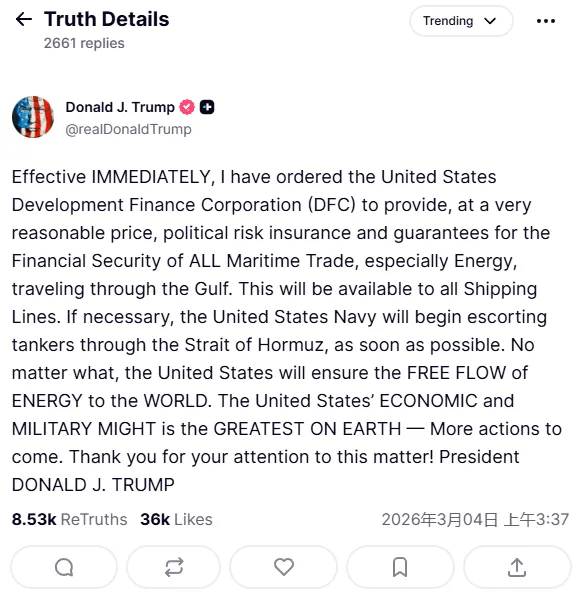 内容翻译:“我已命令美国国际开发金融公司(DFC)以非常合理的价格,为所有穿越波斯湾的海上贸易(特别是能源运输)提供政治风险保险和财务安全担保。该政策将面向所有航运公司开放。如有必要,美国海军将尽快开始为穿越霍尔木兹海峡的油轮提供护航。无论发生什么,美国都将确保全球能源的自由流动。美国的经济和军事实力是全球最强大的——后续还将有更多行动。感谢各位对此事的关注!”