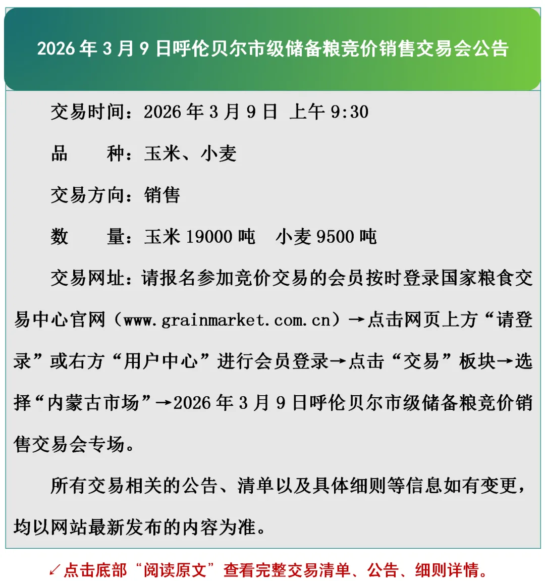 2026年3月9日呼伦贝尔市级储备粮竞价销售交易会公告