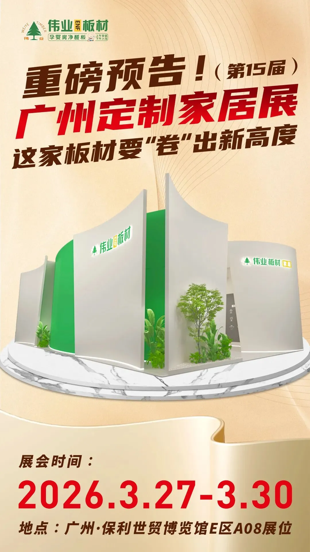 家居潮流,一看便知。2026年3月,广州保利世贸博览馆,伟业板材带你解锁轻奢定制新玩法,我们展会见~