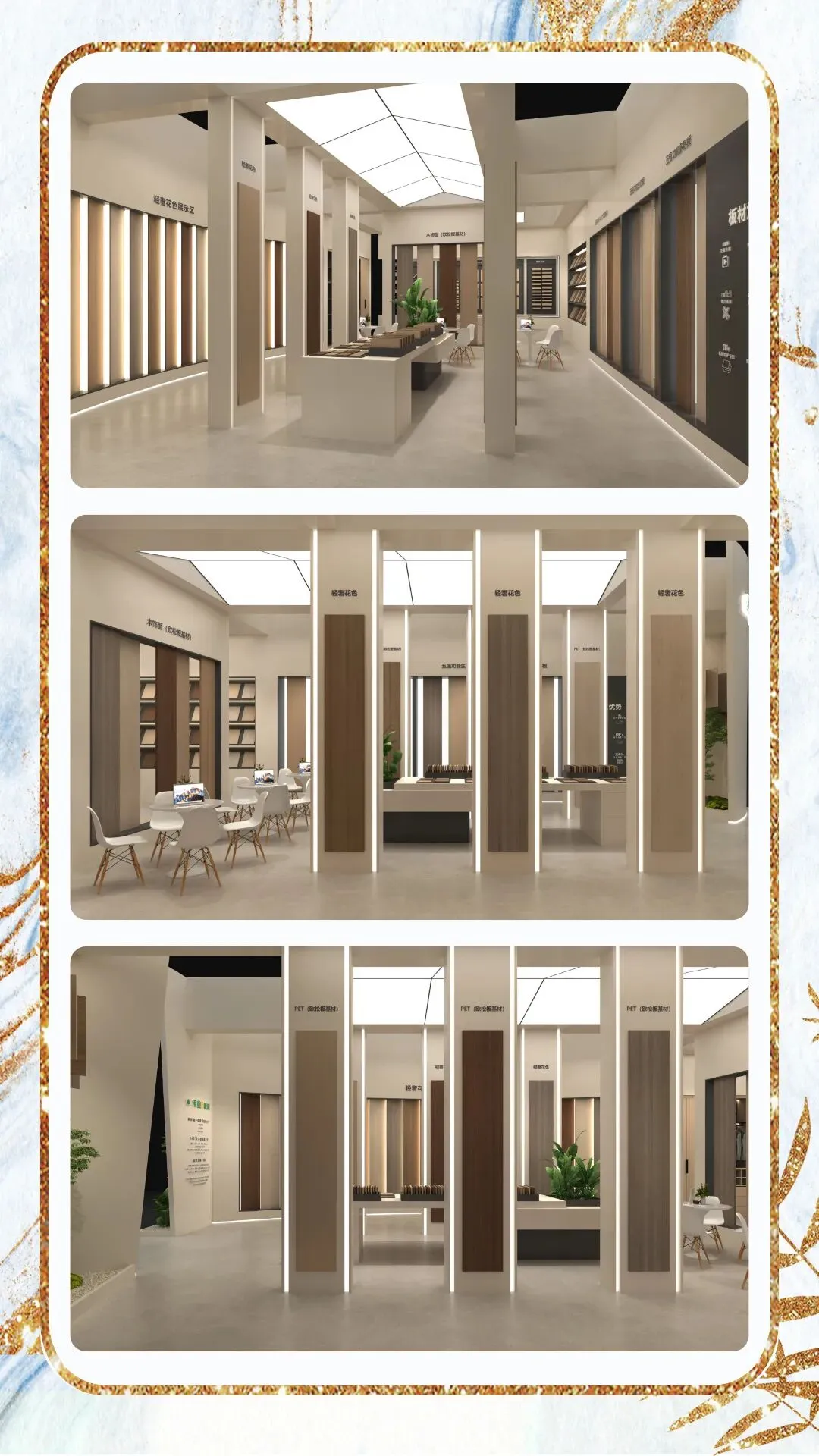 流线型动线布局,从入口到花色墙、功能系统展示区,层层递进;弧形轻奢花色展示墙,灯光打亮每一款木纹,质感瞬间拉满。