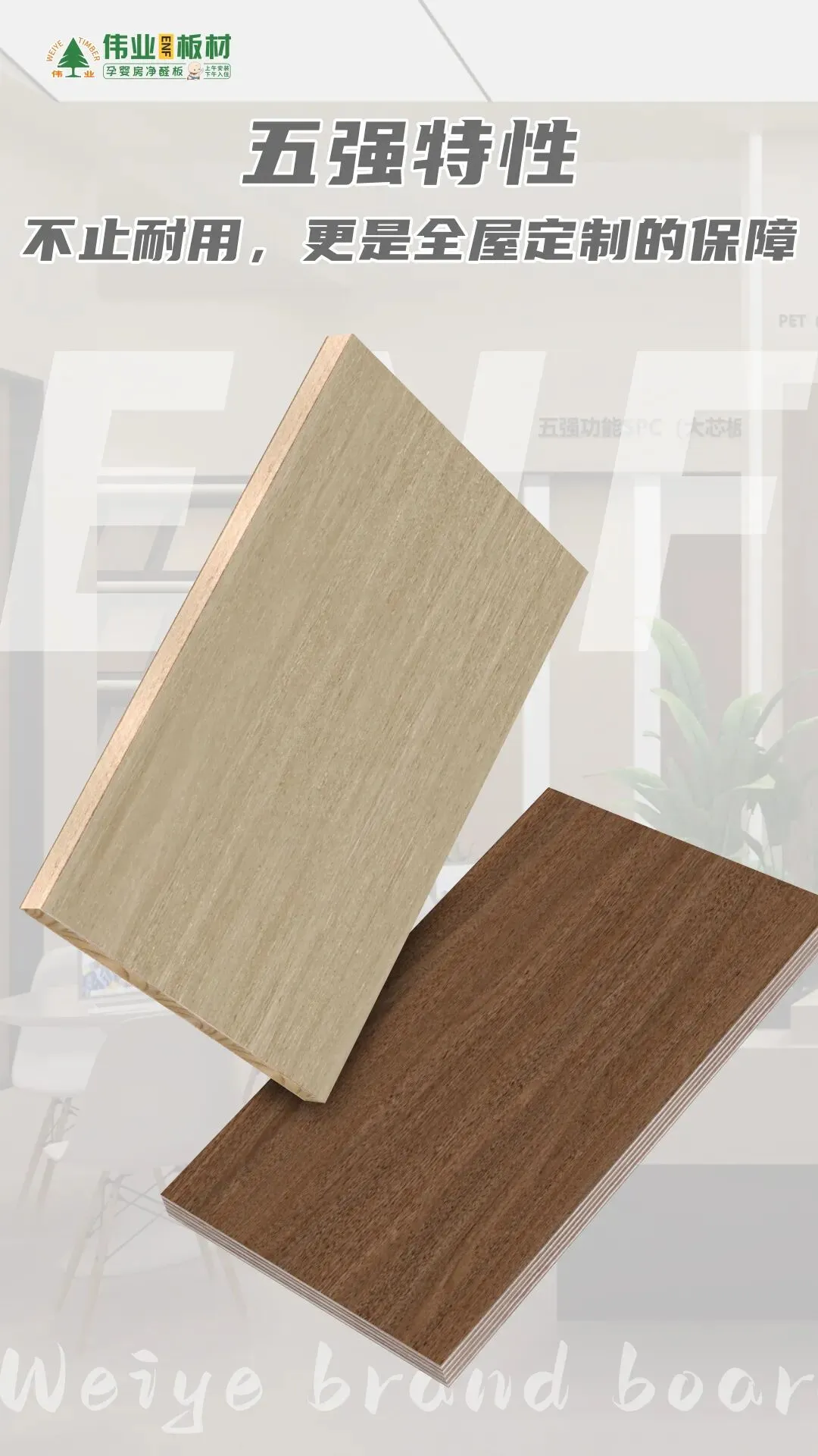 伟业板材以用户痛点为出发点,创新打造“五强”核心技术体系——强净醛、强防虫、强耐水、强阻燃、强定型,从源头筑牢家居安全与耐用的双重防线。