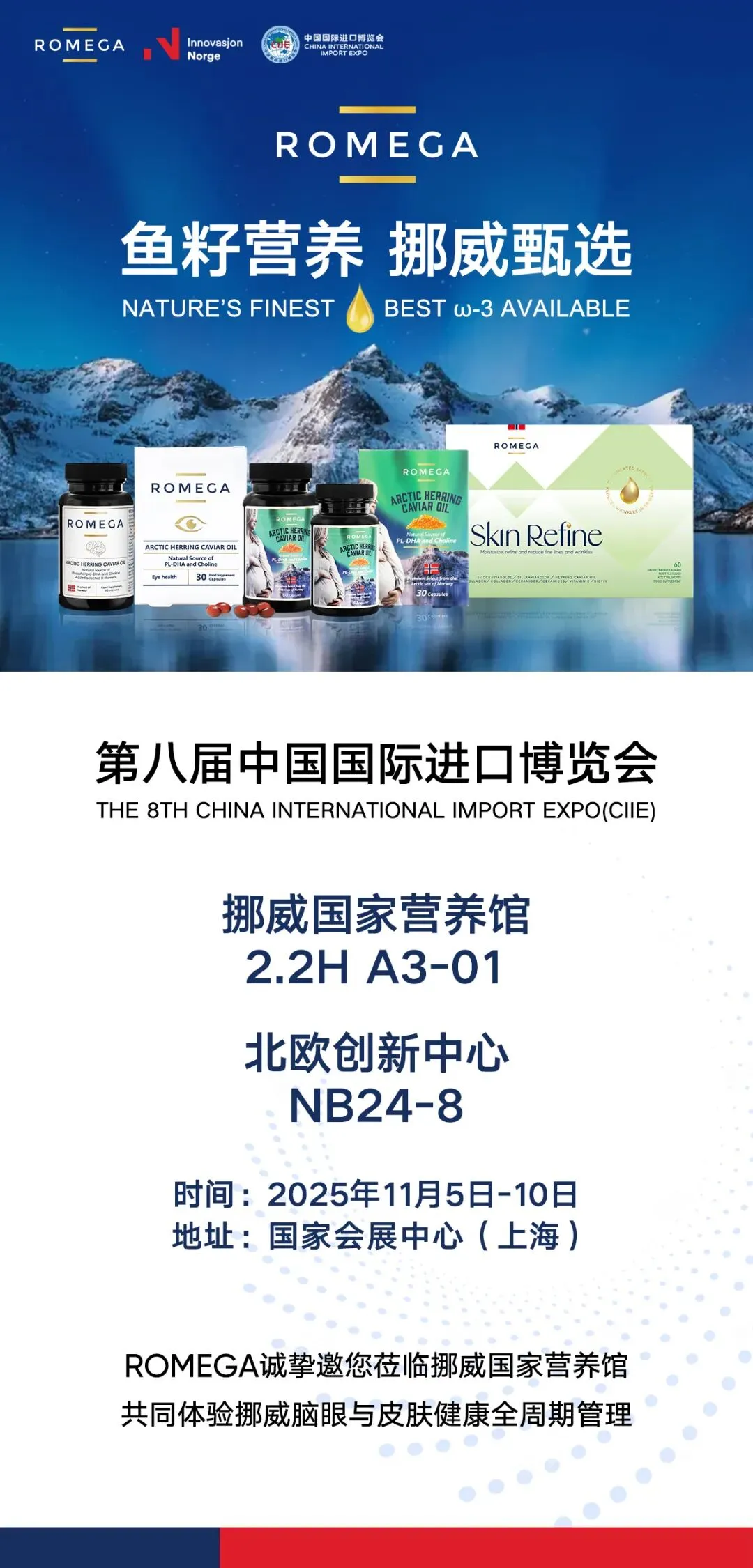 ROMEGA将再度携手挪威创新署,依托蓝色经济可持续开发理念,聚焦挪威北极圈极地海洋资源,展示以磷脂Omega-3为核心的卓越品质。