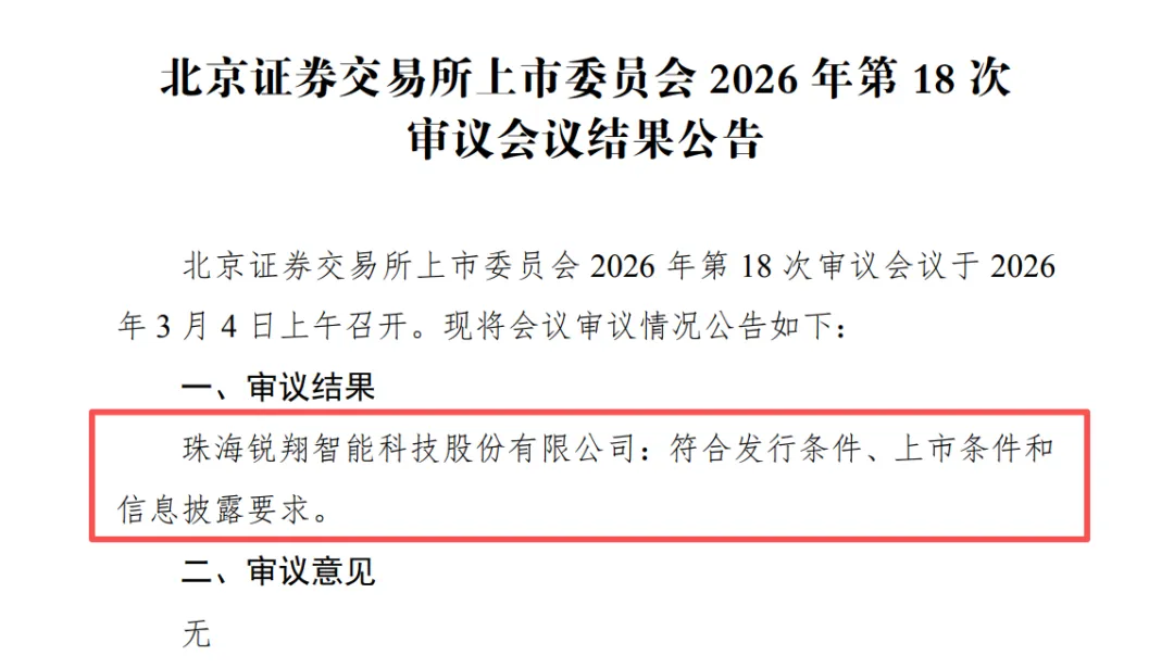 3月4日,珠海锐翔智能科技股份有限公司(简称"锐翔智能"或"公司")接受北交所上市审核委员会2026年第18次审议会议"审核通过"。