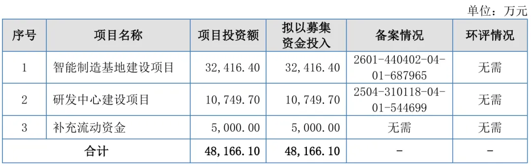公司拟募集资金4.82亿元,全部投向“智能制造基地建设项目”“研发中心建设项目”以及“补充流动资金”。