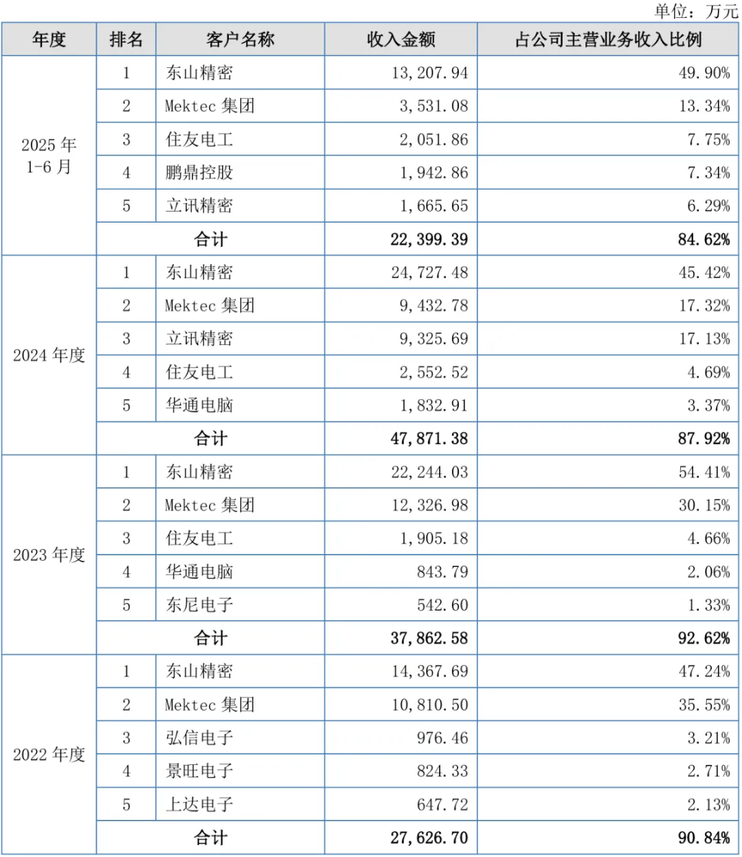 凭借高品质的产品性能、稳定的交付能力以及快速响应的技术服务,公司已成为东山精密、Mektec集团、住友电工、华通电脑、景旺电子、立讯精密、安捷利、鹏鼎控股等多家知名企业的合格供应商。公司终端客户主要为苹果、华为等消费电子龙头企业及特斯拉、比亚迪、宁德时代等新能源领域龙头企业。