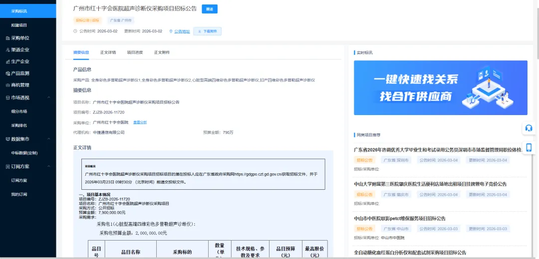 据MDBIDS采购标讯数据库显示,2026年3月2日,广州市红十字会医院发布了关于广州市红十字会医院超声诊断仪采购项目招标公告,计划采购心脏型高端四维彩色多普勒超声诊断仪1套、妇产四维彩色多普勒超声诊断仪1套、全身彩色多普勒超声诊断仪2套,总预算金额为790万元。