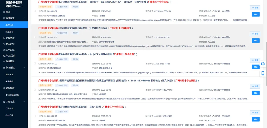 根据招标文件显示,潜在投标人应于2026年03月23日09时30分 (北京时间)前递交投标文件。以“广州市红十字会医院”为关键词,近期还发布了多期招标公告,计划采购内窥镜、CT、DSA设备等医疗设备。