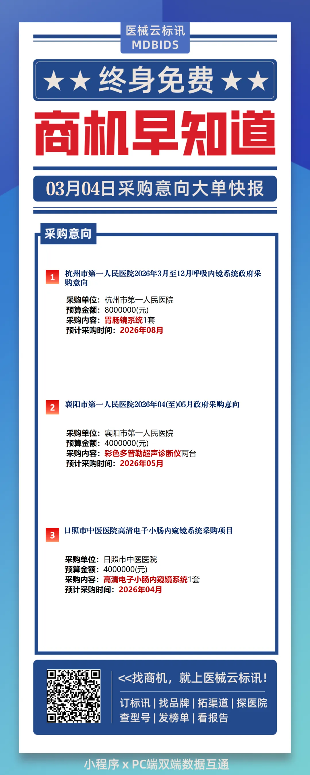 据医械云标讯 MDBIDS Ver4.0整理分析,今日其他热门采购意向如下: