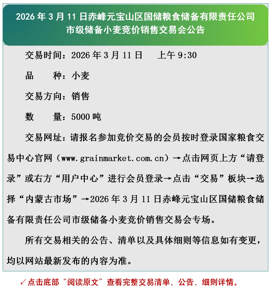 2026年3月11日赤峰元宝山区国储粮食储备有限责任公司市级储备小麦竞价销售交易会公告