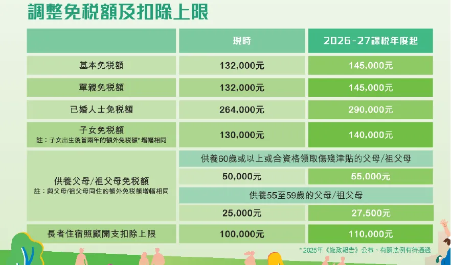 基本免税额由132,000港元增至145,000港元(单身人士)。 已婚人士免税额由264,000港元增至290,000港元。