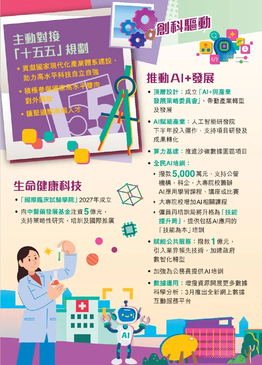 成立“AI+与产业发展策略委员会”:由财政司司长主持,聚焦生命健康及具身智能领域,为产业转型创造有利条件。相关领域的科技公司可重点关注后续出台的具体扶持政策。