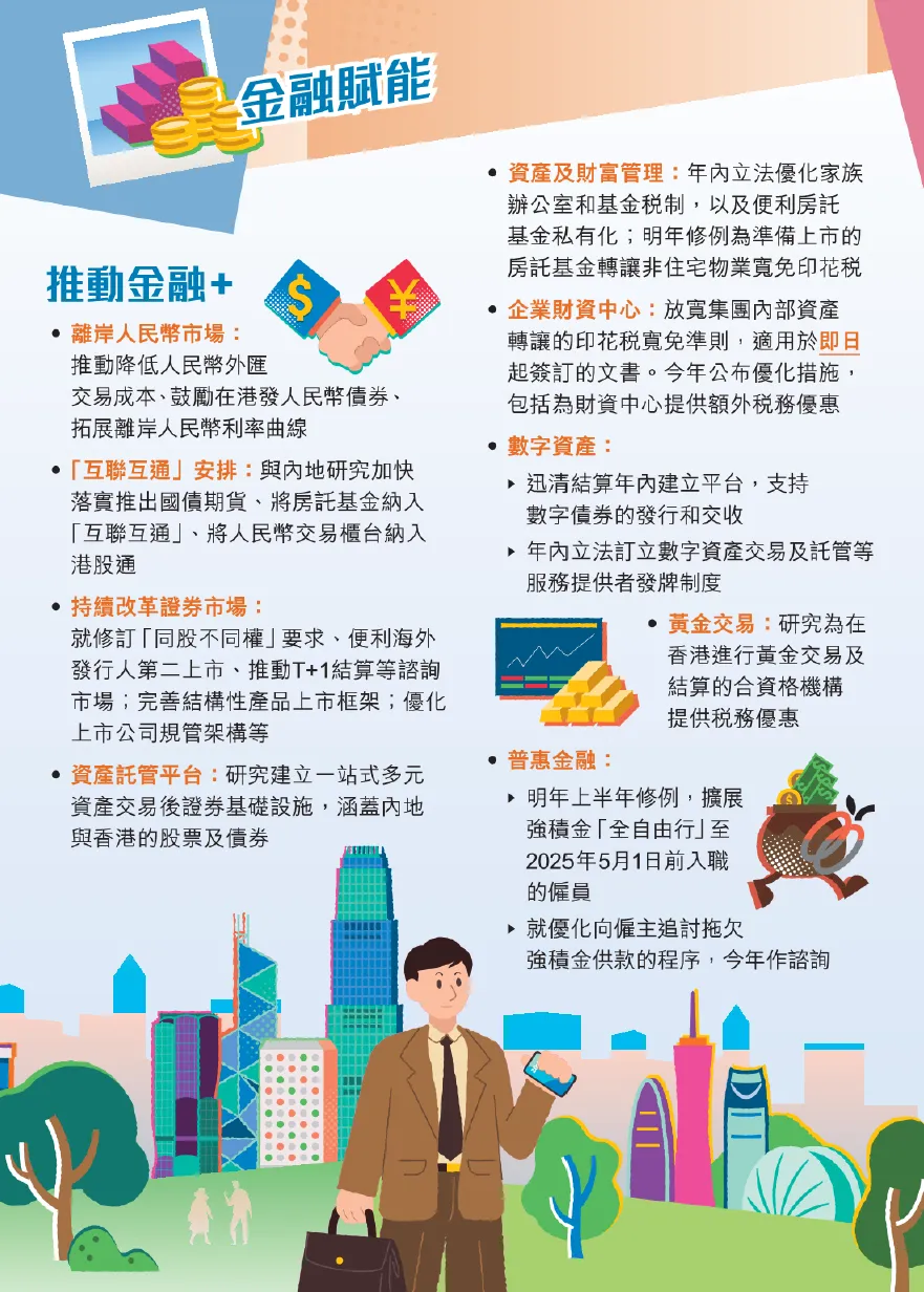 修订“同股不同权”企业上市要求,便利新经济公司融资。 优化IPO流程,为生物科技和特专科技公司上市提供更多弹性。 推动 “T+1”结算周期,提升资金周转效率。 - 改革每手买卖单位及推出无纸化制度,降低交易门槛与成本。
